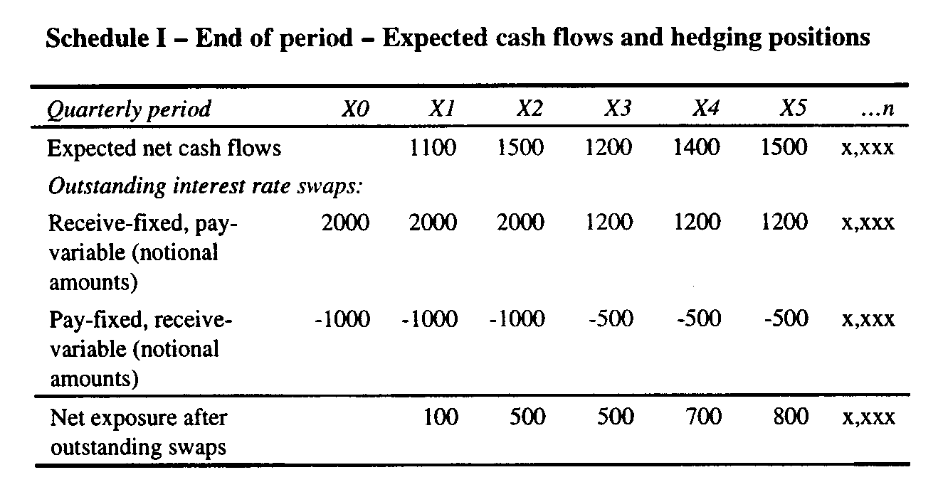 The purpose of this example is to illustrate the process of establishing, monitoring, and adjusting hedge positions and of qualifying for cash flow hedge accounting in applying the approach to hedge accounting described in Question 121-2 when a financial institution manages its interest rate risk on an enterprise-wide basis. To this end, this example identifies a methodology that allows for the use of hedge accounting and takes advantage of existing risk management systems so as to avoid unnecessary changes to it and to avoid unnecessary bookkeeping and tracking. The approach being illustrated herein reflects only one of a number of risk management processes that could be employed and could qualify for hedge accounting. Its use is not intended to suggest that other alternatives could not or should not be used. The approach being illustrated also could be applied in other circumstances (such as for cash flow hedges of commercial companies), for example, hedging the rollover of commercial paper financing. Identifying, assessing and reducing cash flow exposures The discussion and illustrations that follow focus on the risk management activities of a financial institution that manages its interest rate risk by analyzing expected cash flows in a particular currency on an enterprise-wide basis. The cash flow analysis forms the basis for identifying the interest rate risk of the enterprise, entering into hedging transactions to manage the risk, assessing the effectiveness of risk management activities, and qualifying for and applying cash flow hedge accounting. The illustrations that follow assume that an enterprise, a financial institution, had the following expected future net cash flows and hedging positions outstanding in a specific currency, consisting of interest rate swaps, at the beginning of Period X0. The cash flows shown are expected to occur at the end of the period and, therefore, create a cash flow interest exposure in the following period as a result of the reinvestment or repricing of the cash inflows or the refinancing or repricing of the cash outflows. The illustrations assume that the enterprise has an ongoing interest rate risk management program. Schedule I shows the expected cash flows and hedging positions that existed at the beginning of Period X0. It is included herein to provide a starting point in the analysis. It provides a basis for considering existing hedges in connection with the evaluation that occurs at the beginning of Period X1.