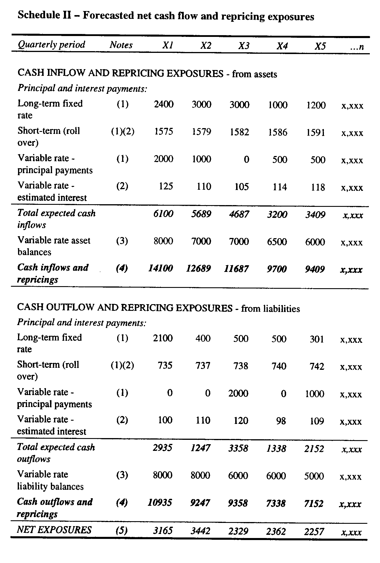 The schedule depicts five quarterly periods. The actual analysis would extend over a period of many years, represented by the notation, "...n". A financial institution that manages its interest rate risk on an enterprise-wide basis re-evaluates its cash flow exposures periodically. The frequency of the evaluation depends on the enterprise's risk management policy. For purposes of this illustration, the enterprise is re-evaluating its cash flow exposures at the end of Period X0. The first step in the process is the generation of forecasted net cash flow exposures from existing interest-earning assets and interest-bearing liabilities, including the rollover of short-term assets and short-term liabilities. Schedule II below illustrates the forecast of net cash flow exposures. A common technique for assessing exposure to interest rates for risk management purposes is an interest rate sensitivity gap analysis showing the gap between interest rate-sensitive assets and interest rate-sensitive liabilities over different time intervals. Such an analysis could be used as a starting point for identifying cash flow exposures to interest rate risk for hedge accounting purposes (see Question 121-2-a).