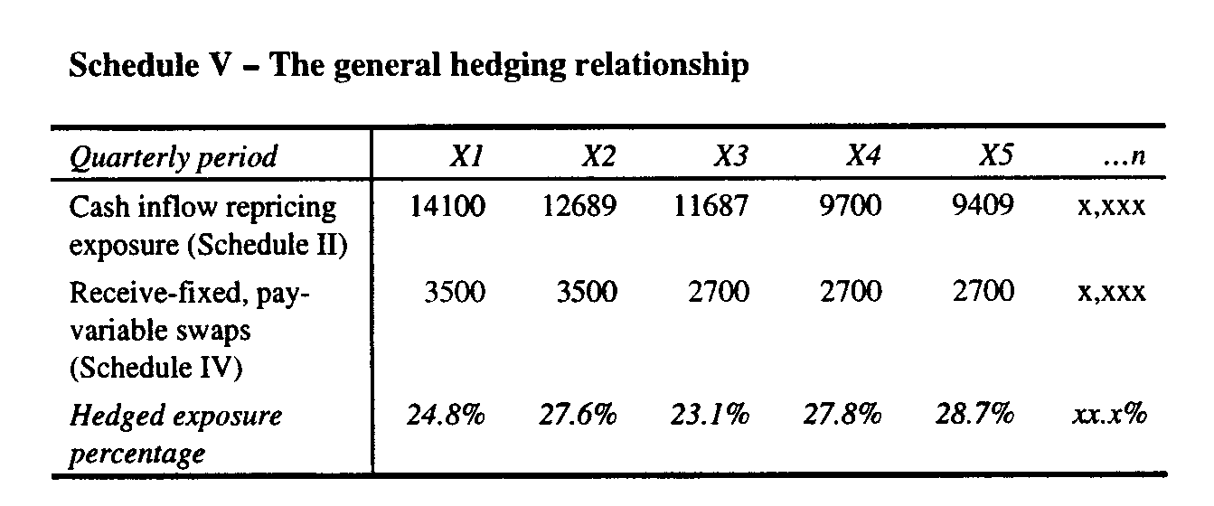 The hedged exposure percentage is computed as the ratio of the notional amount of the receive-fixed, pay-variable swaps that are outstanding divided by the gross exposure. Note that in Schedule V there are sufficient levels of forecasted reinvestments in each period to more than offset the notional amount of the receive-fixed, pay-variable swaps and satisfy the accounting requirement that the forecasted transaction is probable of occurring. It is not as obvious, however, how the interest rate swaps are specifically related to the cash flow interest risks designated as being hedged and how the interest rate swaps are effective in reducing that risk. The more specific designation is illustrated in Schedule VI, The Specific Hedging Relationship, shown below. It provides a meaningful way of depicting the more complicated narrative designation of the hedge by focusing on the hedging objective to eliminate the cash flow variability associated with future changes in interest rates and to obtain an interest rate equal to the fixed rate inherent in the term structure of interest rates that exists at the commencement of the hedge. The expected interest from the reinvestment of the cash inflows and repricings of the assets is computed by multiplying the gross amounts exposed by the forward rate for the period. For example, the gross exposure for Period 2 of 14100 is multiplied by the forward rate for Period 2 to 5 of 5.50%, 6.00%, 6.50%, and 7.25%, respectively, to compute the expected interest for those quarterly periods based on the current term structure of interest rates. The hedged expected interest is computed by multiplying the expected interest for the applicable three-month period by the hedged exposure percentage.