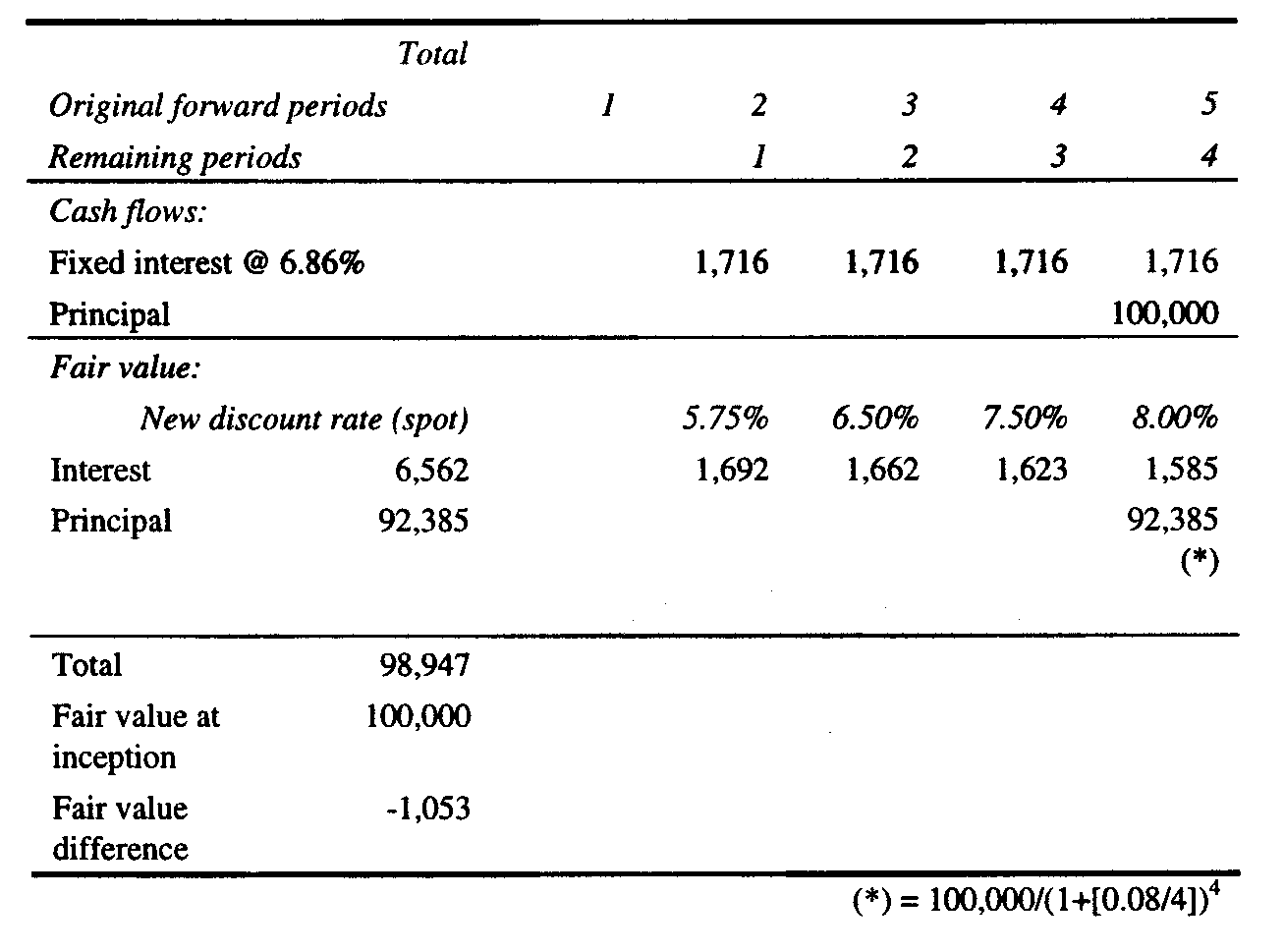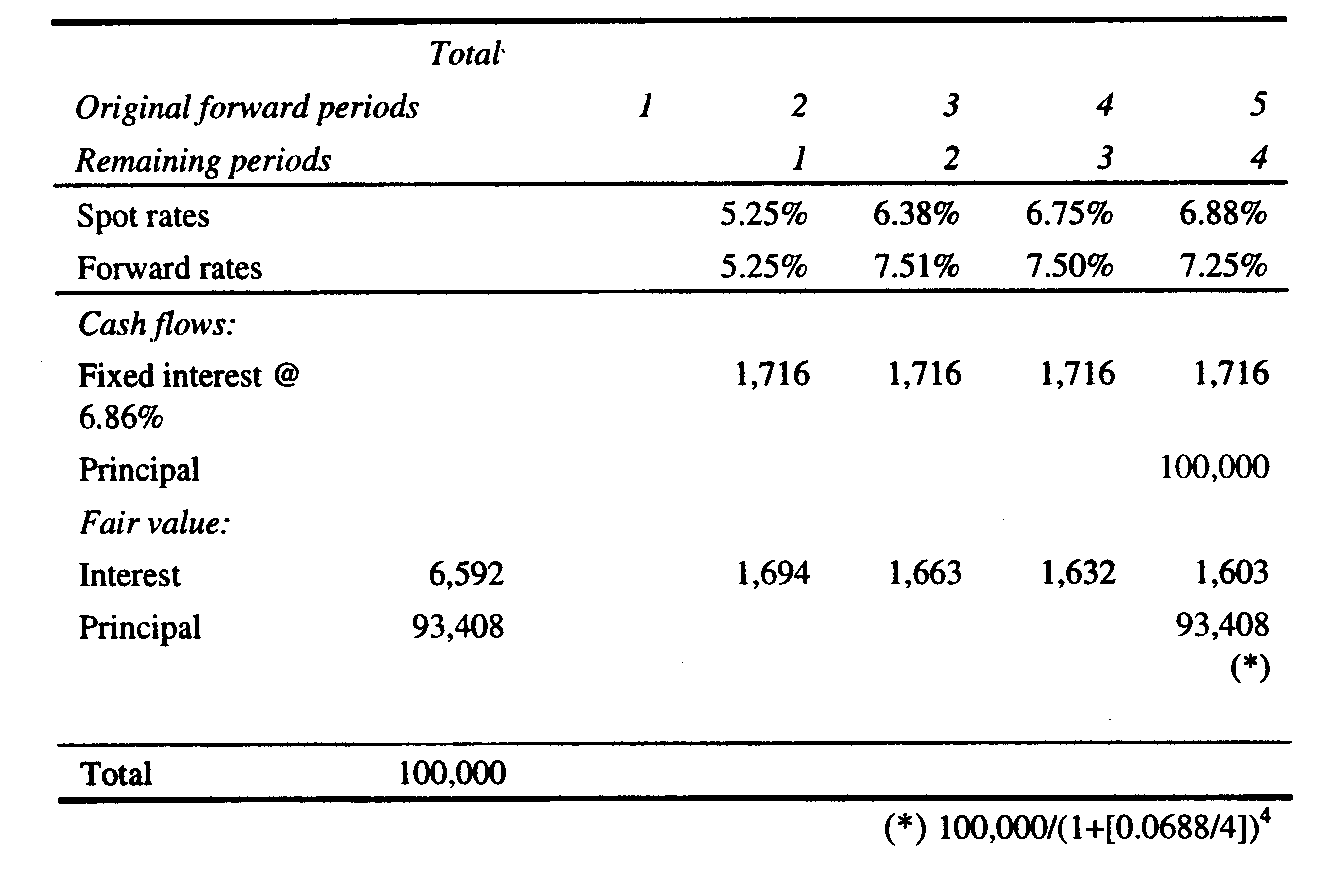 Hedged item In this example, the enterprise expects to issue a 100,000 one-year debt instrument in three months with quarterly interest payments. The enterprise is exposed to interest rate increases and would like to eliminate the effect on cash flows of interest rate changes that may occur before the forecasted transaction occurs. If that risk is eliminated, the enterprise would obtain an interest rate on its debt issuance that is equal to the one-year forward coupon rate currently available in the marketplace in three months. That forward coupon rate, which is different from the forward (spot) rate, is 6.86%, computed from the term structure of interest rates shown above. It is the market rate of interest that exists at the inception of the hedge, given the terms of the forecasted debt instrument. It results in the fair value of the debt being equal to par at its issuance. At the inception of the hedging relationship, the expected cash flows of the debt instrument can be calculated based on the existing term structure of interest rates. For this purpose, it is assumed that interest rates do not change and that the debt would be issued at 6.86% at the beginning of Period 2. In this case, the cash flows and fair value of the debt instrument would be as follows at the beginning of Period 2: Issuance of fixed rate debt Table #1