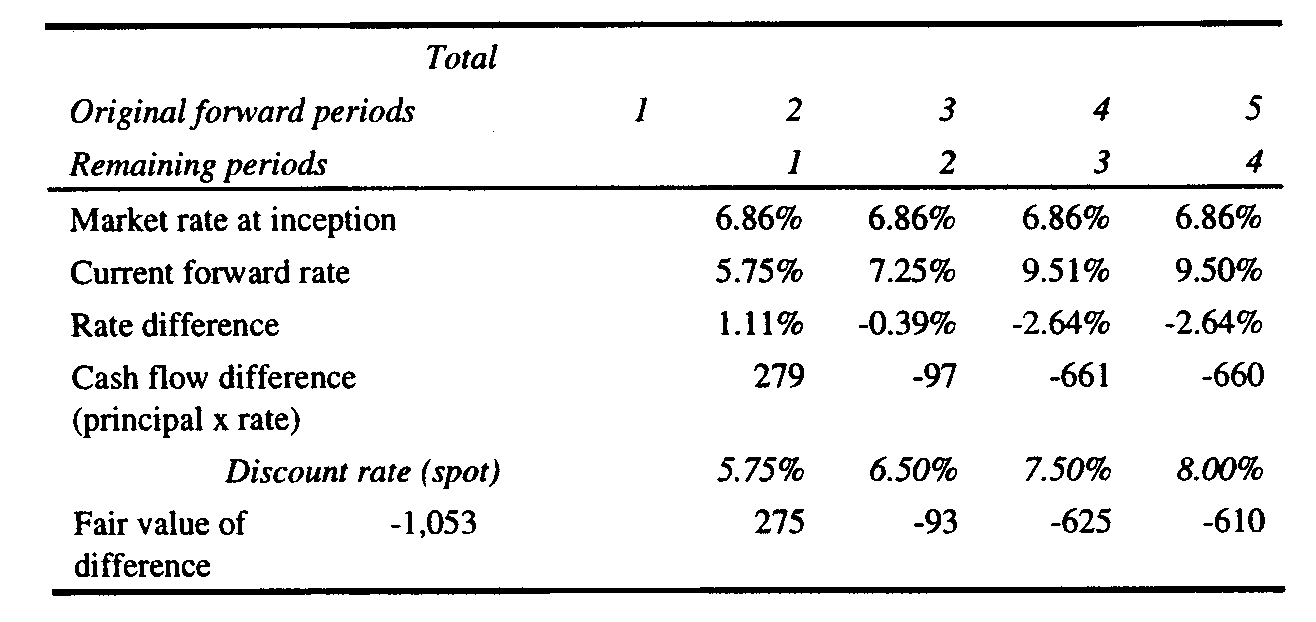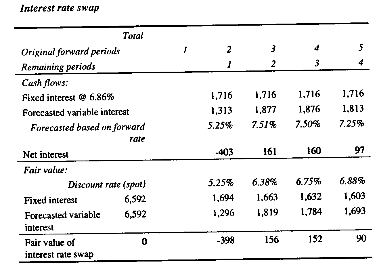 Hedging instrument The objective of the hedge is to obtain an overall interest rate on the forecasted transaction and the hedging instrument that is equal to 6.86%, which is the market rate at the inception of the hedge for the period from Period 2 to Period 5. This objective is accomplished by entering into a forward starting interest rate swap that has a fixed rate of 6.86%. Based on the term structure of interest rates that exist at the inception of the hedge, the interest rate swap will have such a rate. At the inception of the hedge, the fair value of the fixed rate payments on the interest rate swap will equal the fair value of the variable rate payments, resulting in the interest rate swap having a fair value of zero. The expected cash flows of the interest rate swap and the related fair value amounts are shown as follows: Table #2