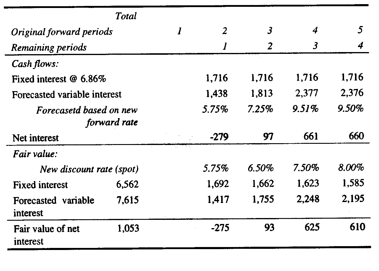 Under Method A, a computation is made of the fair value in the new interest rate environment of debt that carries interest that is equal to the coupon interest rate that existed at the inception of the hedging relationship (6.86%). This fair value is compared with the expected fair value as of the beginning of Period 2 that was calculated based on the term structure of interest rates that existed at the inception of the hedging relationship, as illustrated above, to determine the change in the fair value. Note that the difference between the change in the fair value of the swap and the change in the expected fair value of the debt exactly offset in this example, since the terms of the swap and the forecasted transaction match each other. Method B -- Compute change in fair value of cash flows Table #6