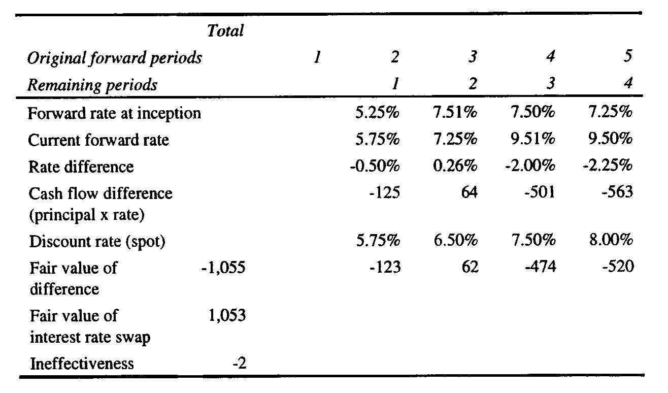 Other considerations There is an additional computation that should be performed to compute ineffectiveness prior to the expected date of the forecasted transaction that has not been considered for purposes of this illustration. The fair value difference has been determined in each of the illustrations as of the expected date of the forecasted transaction immediately prior to the forecasted transaction, that is, at the beginning of Period 2. If the assessment of hedge effectiveness is done before the forecasted transaction occurs, the difference should be discounted to the current date to arrive at the actual amount of ineffectiveness. For example, if the measurement date were one month after the hedging relationship was established and the forecasted transaction is now expected to occur in two months, the amount would have to be discounted for the remaining two months before the forecasted transaction is expected to occur to arrive at the actual fair value. This step would not be necessary in the examples provided above because there was no ineffectiveness. Therefore, additional discounting of the amounts, which net to zero, would not have changed the result. Under Method B, ineffectiveness is computed based on the difference between the forward coupon interest rates for the applicable periods at the effectiveness measurement date and the interest rate that would have been obtained had the debt been issued at the market rate that existed at the inception of the hedge. Computing the change in cash flows based on the difference between the forward interest rates that existed at the inception of the hedge and the forward rates that exist at the effectiveness measurement date is inappropriate if the objective of the hedge is to establish a single fixed rate for a series of forecasted interest payments. This objective is met by hedging the exposures with an interest rate swap as illustrated in the above example. The fixed interest rate on the swap is a blended interest rate composed of the forward rates over the life of the swap. Unless the yield curve is flat, the comparison between the forward interest rate exposures over the life of the swap and the fixed rate on the swap will produce different cash flows whose fair values are equal only at the inception of the hedging relationship. This difference is shown in the table below: