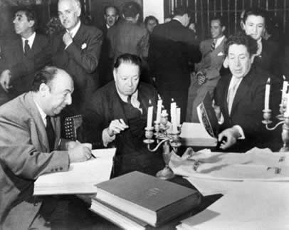 Pablo Neruda, Diego Rivera, and David Siqueiros signing the first edition of Canto general in Mexico City in 1950.