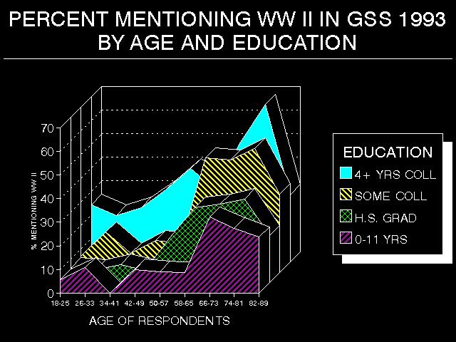 Across the social landscape, where does this particular collective memory find its most fertile ground? Not surprisingly, there are clear correlations involving age and education. Those 65 years of age and older were three times as likely to mention the Second World War as were those 41 years of age or younger. Among the latter, those with four or more years of college education were three-and-one-half times more likely to mention the war than those with a high school degree or less.