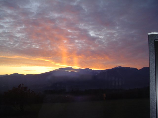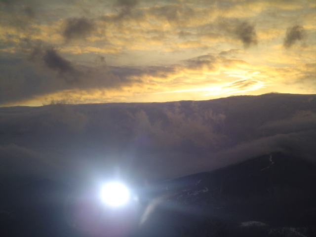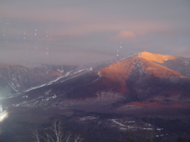 Several of the 60 Cannon Mountain ski trails is visible in the sunrise