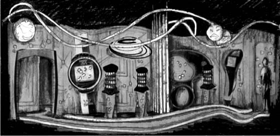 Once the client steps inside the product room, he is in an entry way which is lined by bouncing balls. The curvlinear room is buzzing with kinetic activity. Balls are trapped inside various products and walls, bouncing with excitement via enclosed air jet chambers. Over head there are three clear tubes which crisscross the room in a whip like fashion. Air balls are shot through the tubes at ranbom. The curved wall are "wallpapered" with circuitary and "ball" shapes (resistors, capacitors, etc.). All lines and shapes reinfornce activity, excitement and a fast pace. This is a "hip" "happenin' " room. The pathway is serpentine and lined with curbs which are lined with non-neon rope lights. There are large oversized relief and sculptured products (Fortune, Pen, Watch, Dancer) attached to the walls. The screens on these product sculptures are portholes filled with bouncing air balls. Hanging over the product displays are 3-D character balls. The walkway s-curves to avoid one of the building's posts. Attached to the posts are decorative veritcal tubs with balls inside. It is at this point that the clients will be is the "technically right" distance position away from the video bank wall. Any closer and the visual field will be too close. The display tables will need to be discussed once products sizes are given. There is ample display space for all including the added Games Line. I see the room in UV like colors. HOT HOT HOT. In my opinion, this room NEEDS the 3-D relief Products on the walls to compete with the Operation Bug room which has sculpture and the next room, Voltron which has an action figure relief sculpture. The scultures, the tubes, the kinetic quality plus the neon colors will make this room a "stand out" for the SHOW and for the clients.