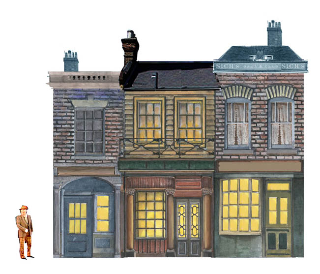 Quarter Inch Scale of 3 Buildings. Study of Style and Tone of Buildings. Bottom windows would be practical display windows showing Christmas displays. Examples: Toy Store with practice trains, Floral Shop with Christmas Tree, Candle Shop with Christmas candles, etc. Second floor windows as light boxes. Possible smoke for Chimneys.