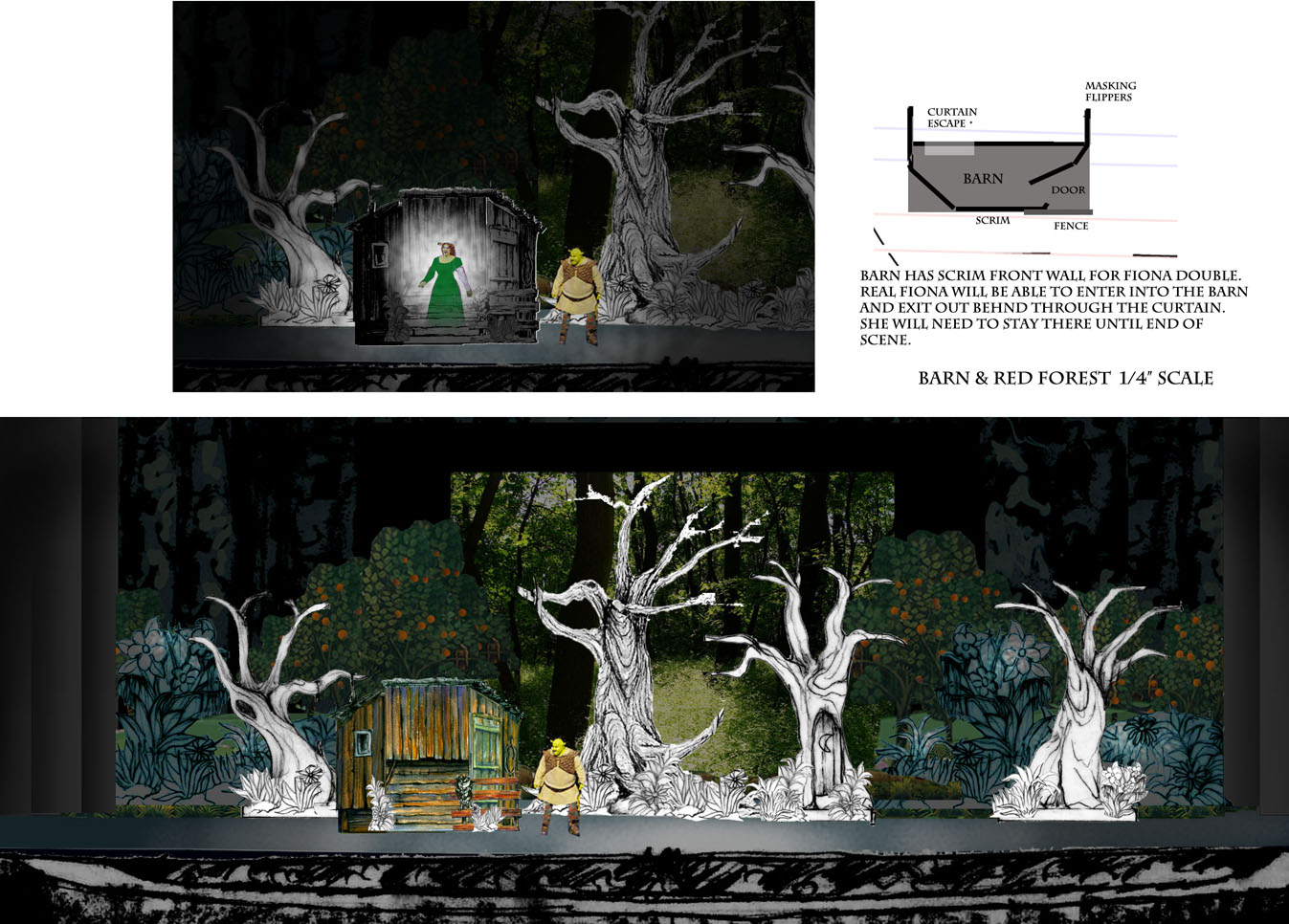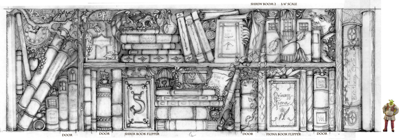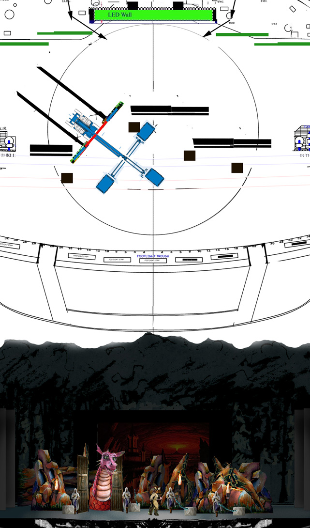 04.22.14 Fiona's at the Dragon's Keep. Bookcase is placed onto an elevated wagon for this scene. Shrek will be able to climb the back side. We will be able to do some of the scene in the balcony, then climb over the front rail, through the clouds and then onto the stage ... Dragon Keep.