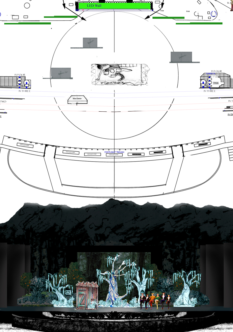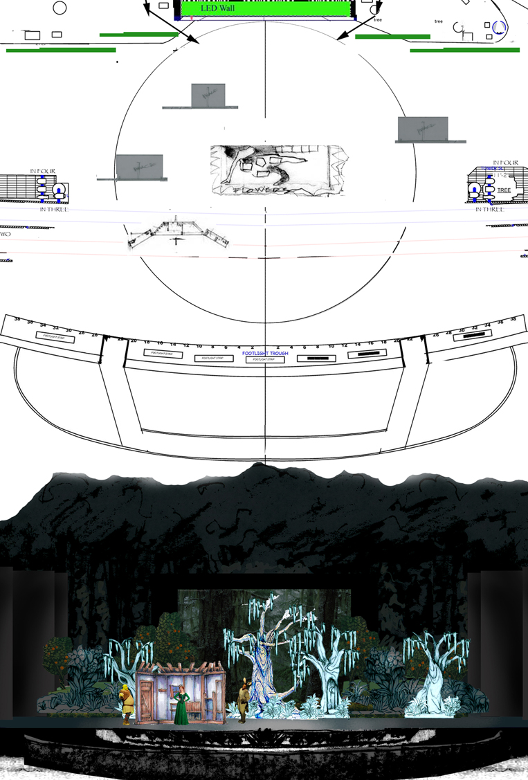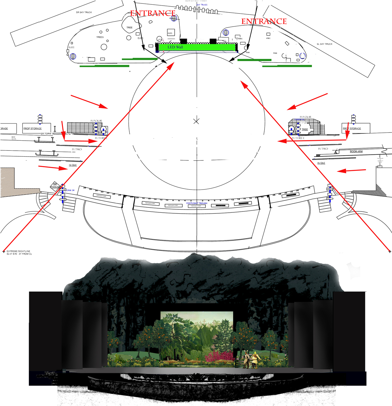 03.13.13 Background Detail. The Ground Rows unify the LED screen and make it specific to Shrek. The LED screen is showing a work from Henri Rousseau, who is the inspiration for the style of the design