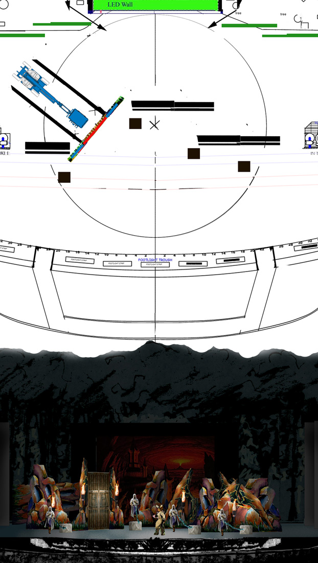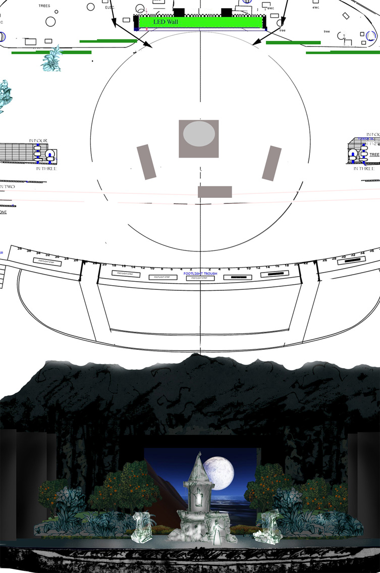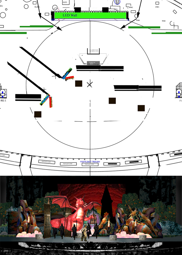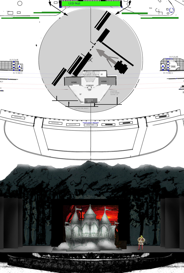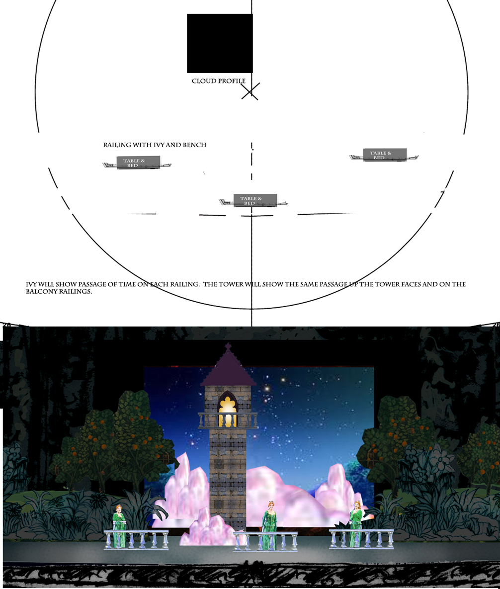 04.22.14 Tower Plan. Each unit is an identical Castle bookcase. IA carpenters are inside each unit to pivot it when in focus. There is a cloud ground row in front of the LED screen. The Castle Tower in the clouds in projected on the LED screen. The artwork shown here is a drop from a previous Shrek production. It is a sample only as we will develop our own artwork.