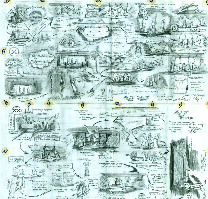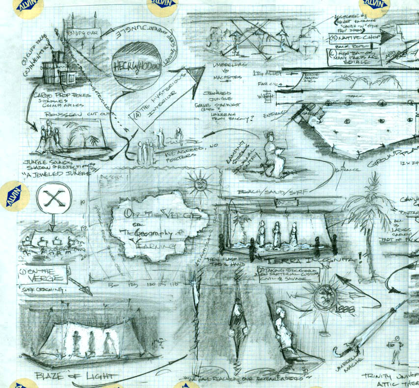 Objective: At some point, the subjective limitless bounds of possibilities needs to find form for a specific space with a specific budget, director and actors. Discovering the essential elements of a design might manifest themselves as you create concrete doodles by walking the line of the play.