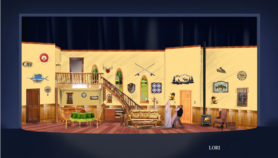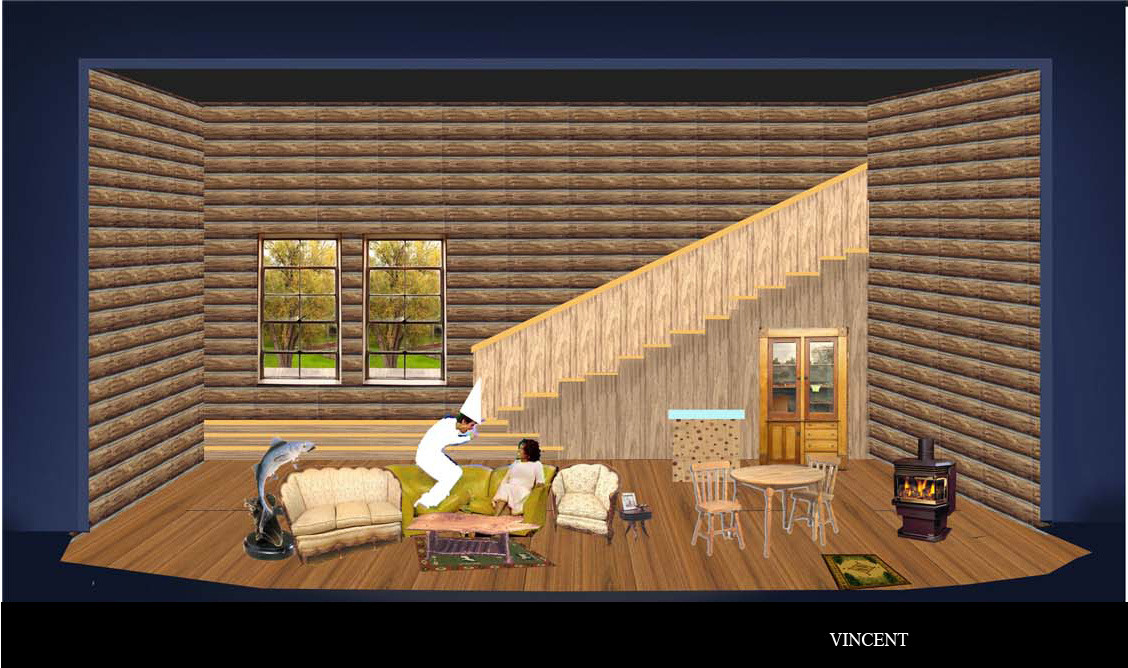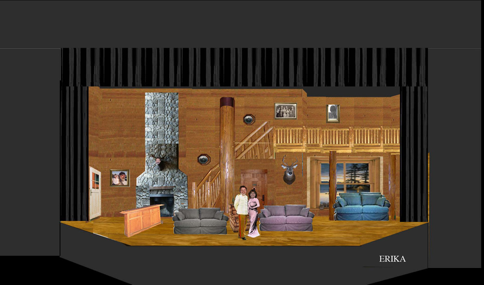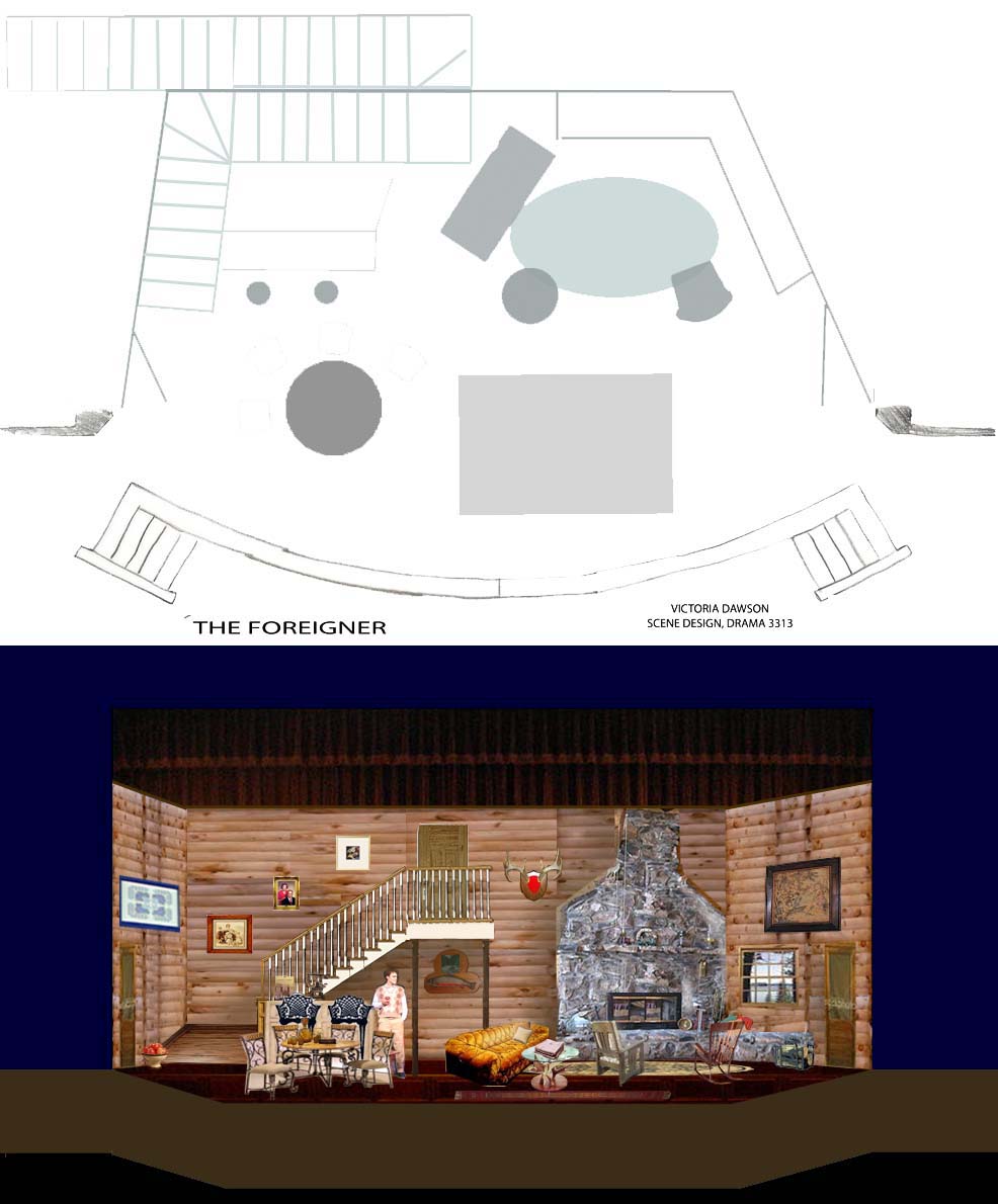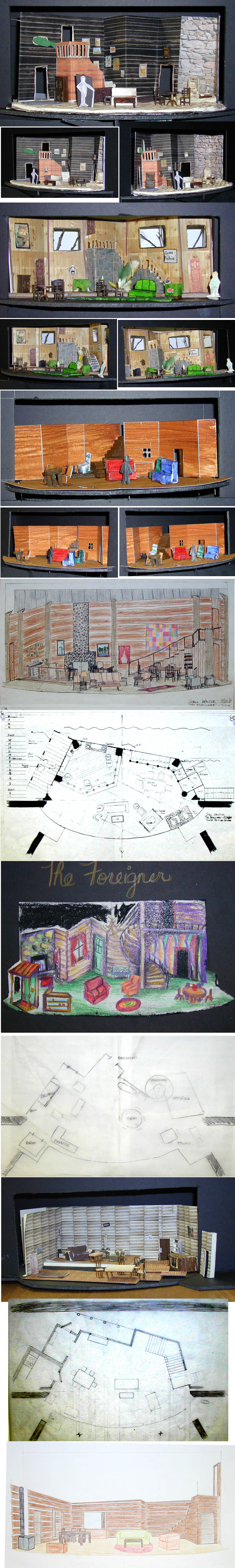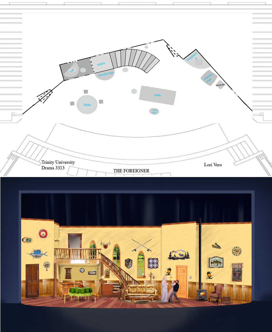 OVERVIEW: For our next project, we will use THE FOREIGNER as our text to engage in the process of creating a scenic design from a script to the drafting board to the computer to a final rendering. Our emphasis will be both a continuation of learning the Photoshop software on the MAC and the process of translating the play into an environment for the stage. Our space is the Stieren Theatre. You will develop a design for THE FOREIGNER as a colored Front Elevation with a 1⁄4” Ground Plan.