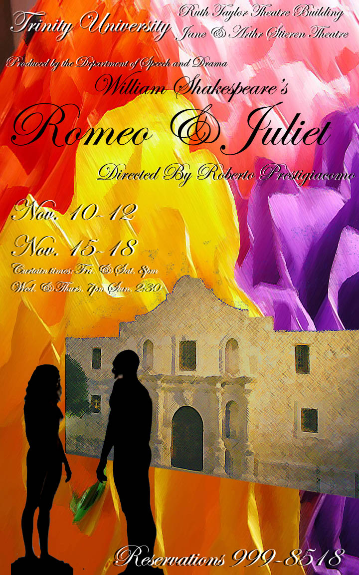 Assignment: For the first project in this course, students will design a poster to promote one of Trinity's main stage productions: Romeo & Juliet, The Laramie Project or Madwoman of Chaillot. The finished design will be a glossy 11x17 poster and a 300 dpi Photoshop file. To achieve the final result, the students will both undergo the steps involved in the creation of a design and hone their skills in Adobe Photoshop.