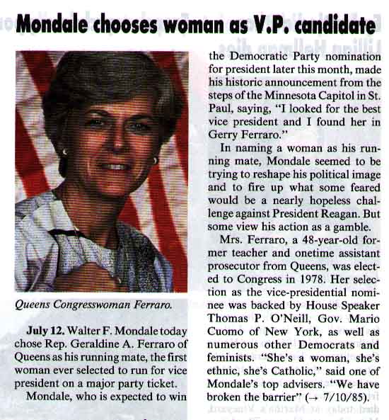 I personally was always partial to the Democratic nominee for vice-president. Mondale didn't excite me, but I thought Ferraro was fantastic. If you ever get a chance to watch the vice-presidential debate, do so, and chuckle. I think it's better than the Bentsen-Quayle debate myself.