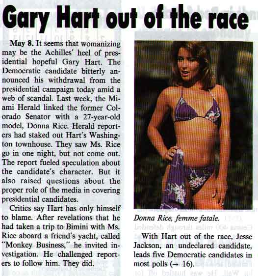 First, the Gary Hart debacle. This man actually ran pretty high in the polls at one point.